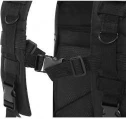 Nosný systém s profilovanými ramennými popruhmi a rýchloodopínacími sponami umožní okamžité zloženie batohu. Hrudný a odnímateľný bedrový pás stabilizujú záťaž a šetria chrbát, zatiaľ čo kompresné popruhy udržia obsah pevne na mieste. Pásky PALS sú kompatibilné so systémom MOLLE na pripevnenie dodatočných vreciek a výbavy.
