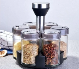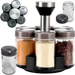 Praktický otočný organizér na koreniny so 6 sklenenými koreničkami udrží vašu kuchyňu prehľadnú a koreniny vždy po ruke. Otočný stojan 360° zabezpečuje rýchly prístup, sklenené nádoby chránia arómu a viečka s dávkovačom uľahčia presné dochucovanie.