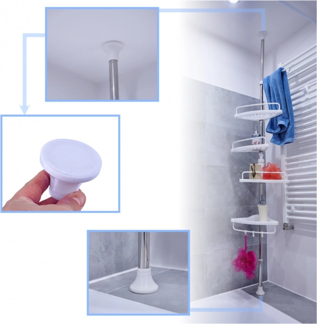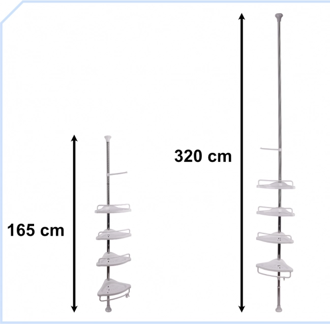 Na chýbajúce miesto v kúpeľni ideálne poslúži rohová teleskopická kúpeľňová polica, ktorú môžete umiestniť pod sprchu bez akýchkoľvek nástrojov. Policu stačí zložiť a postaviť na vybrané miesto. Teleskopická konštrukcia umožní jej dokonalé prispôsobenie vašej kúpeľni!