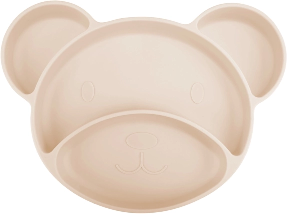 Praktický silikónový tanier s prísavkou v tvare medvedíka je ideálny na prvé príkrmy a metódu BLW. Vďaka štyrom priehradkám ľahko rozdelíte jedlo, zatiaľ čo protisklzová prísavka udrží tanier na mieste. Je vyrobený zo 100% potravinárskeho silikónu, je odolný a nerozbitný, možno ho umývať v umývačke a ohrievať v mikrovlnnej rúre. Bez BPA, PVC a ftalátov.