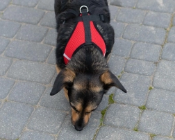Rýchloupínacia pracka a kovový D-krúžok pre isté pripnutie vodítka. Postroj nasadíte aj veľmi živému miláčikovi behom chvíľky.