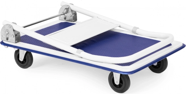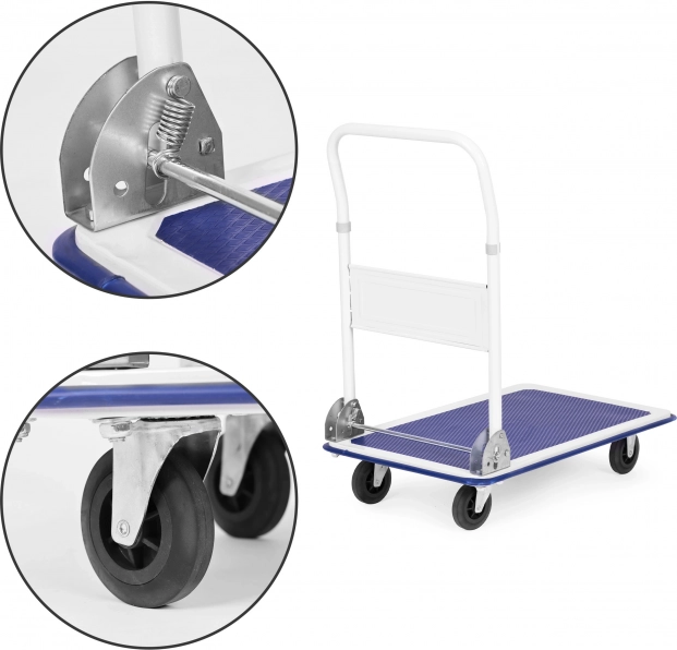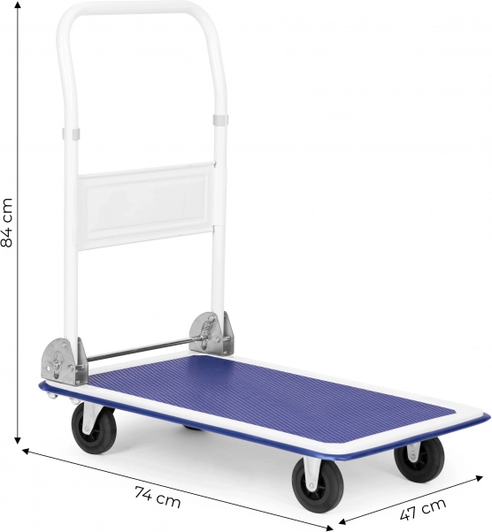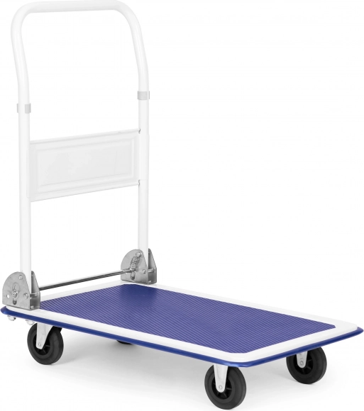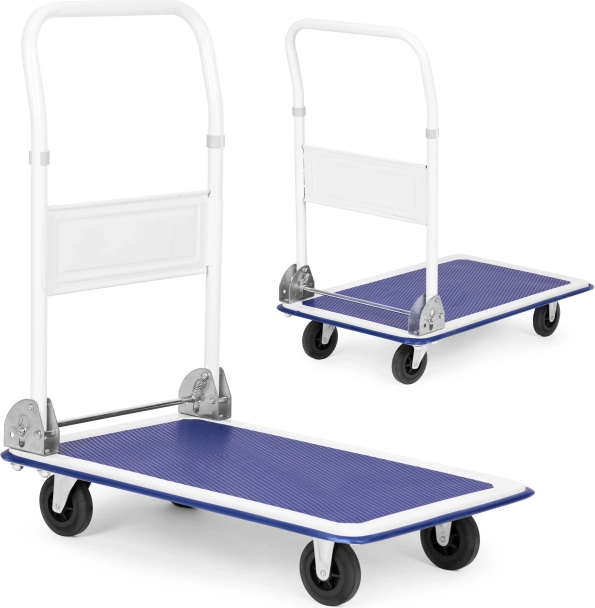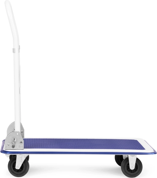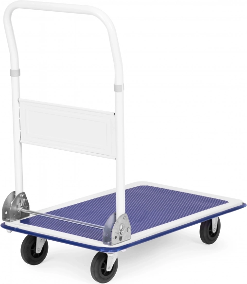 Univerzálny plošinový vozík so skladacou rukoväťou, ideálny pre sklady, predajne a distribučné centrá. Robustná, práškovo lakovaná kovová konštrukcia s protišmykovou ložnou plochou a odolnými gumovými kolieskami (2 otočné) zaistí bezpečnú manipuláciu až do 150 kg.