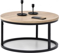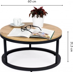 Štýlový okrúhly konferenčný stolík s priemerom 60 cm v modernom loft štýle. Odolná laminovaná doska z drevotriesky, stabilný kovový rám s práškovým lakom a ochranné nožičky na ochranu podlahy. Jednoduchá údržba, ideálny do obývačky aj spálne.