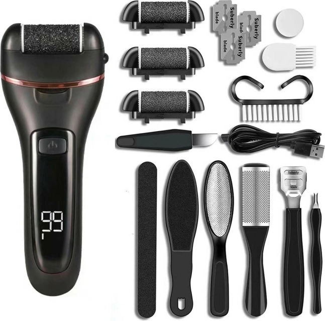 Elektrická brúska na päty, ideálna na odstránenie nadmerne zrohovatenej kože z chodidiel. Je vybavená vstavanou batériou, LED osvetľovacou lampou a čitateľným LCD displejom, ktoré výrazne uľahčujú používanie. Jej štíhla a kompaktná konštrukcia zabezpečuje pevný úchop pri práci bez únavy rúk. Súčasťou balenia sú 3 hlavice s rôznou zrnitosťou (2 hrubozrnné a 1 jemná) a množstvo ďalších doplnkov, ako kefky a pilníky na presnejšiu starostlivosť.