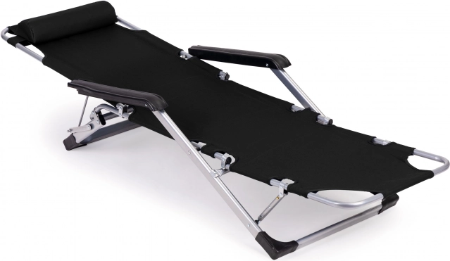 Kovový rám, protišmykové koncovky a 3-polohová opierka nôh pre bezpečný komfort. Ležadlo rýchlo zložíte a odnesiete.