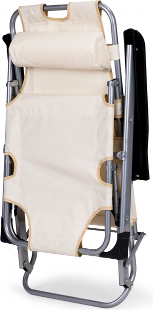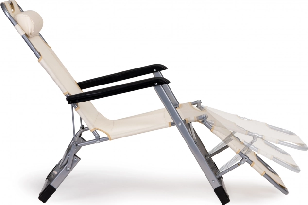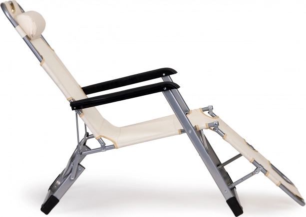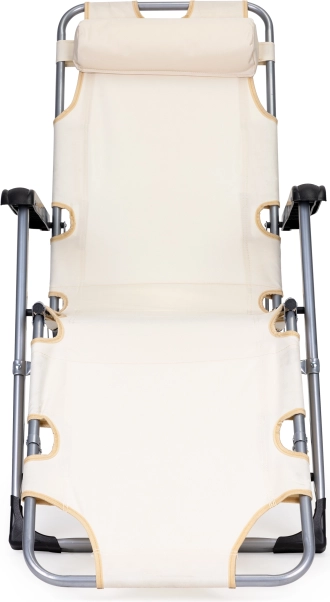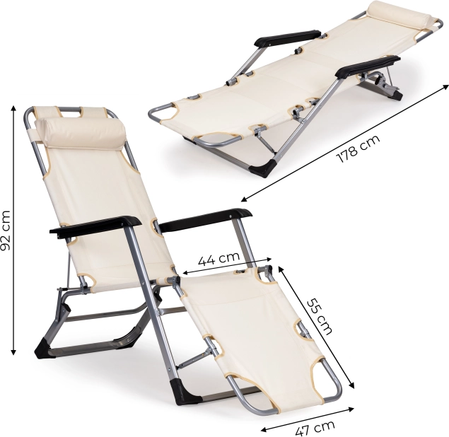 Praktické 2v1: kreslo aj ležadlo – behom chvíľky ho rozložíte do úplne rovnej polohy pre pohodlné opaľovanie alebo relax. Béžové čalúnenie sa skvele hodí do každého exteriéru a pevná kovová konštrukcia zaistí dlhú životnosť aj pri častom používaní vonku.