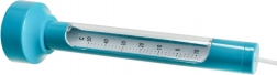 Teplomer je vyrobený z odolného plastu a disponuje prehľadnou stupnicou v Celsius aj Fahrenheit. Pomocou priloženej šnúrky ho ľahko upevníte na rebrík, schodíky alebo okraj bazéna, aby neodplával.