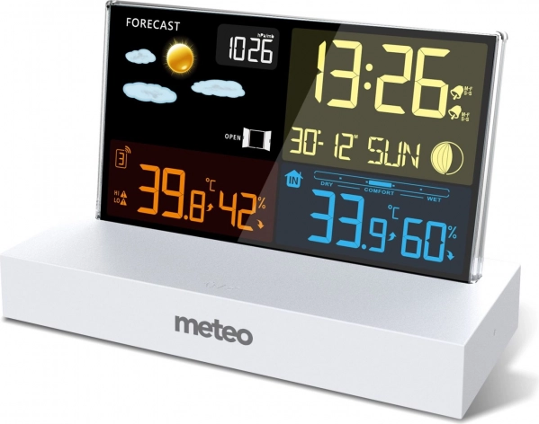 Inteligentná meteorologická stanica METEO s presnou predpoveďou počasia, barometrom, meraním teploty a vlhkosti vnútri aj vonku a DCF hodinami na automatické nastavenie času. Farebný displej je výborne čitateľný, nechýbajú mesačné fázy, komfortný index ani teplotný alarm. Súčasťou je bezdrôtové čidlo s dosahom až 60 m a sieťový adaptér.