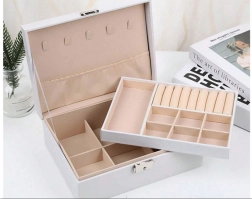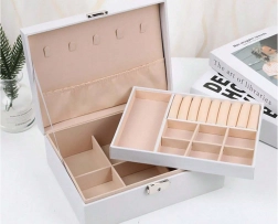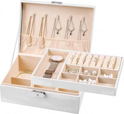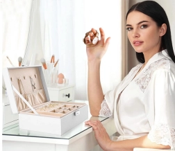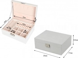 Elegantná biela šperkovnica s organizérom na prehľadné uloženie prsteňov, náušníc, náramkov, retiazok aj hodiniek. Má vyberateľnú priehradku, mäkké zamatové čalúnenie proti poškriabaniu a zamkýnanie na kľúč pre bezpečné uloženie cenností.