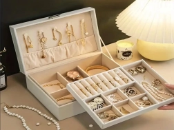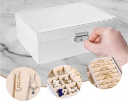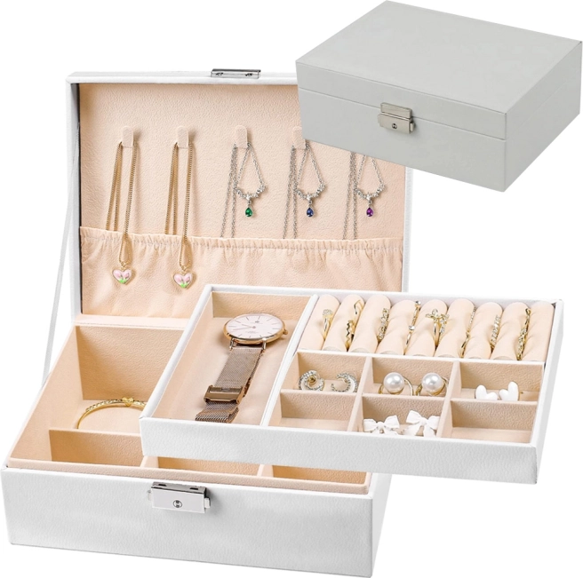 Táto štýlová šperkovnica z kvalitnej eko kože v bielej farbe ponúka veľkorysý priestor a premyslené usporiadanie pre všetky vaše doplnky. Mäkký zamatový interiér chráni šperky pred poškriabaním, zatiaľ čo kovový zámok na kľúč zaisťuje ich bezpečie.