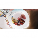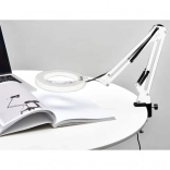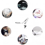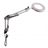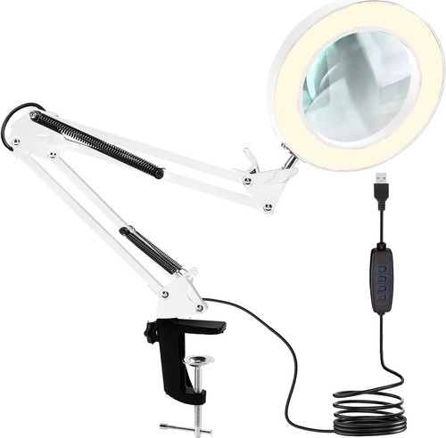 Praktická stolná lampa s lupou a kruhovým LED osvetlením na precíznu prácu v kozmetike, manikúre, remeslách aj elektronike. Ponúka 3 farby svetla (teplá, neutrálna, studená), 10 úrovní jasu, stabilné kovové rameno s pružinami a svorníkový držiak na dosku stola. Sklenená šošovka 3× zväčšenie poskytuje ostrý obraz bez skreslenia. Napájanie cez USB s ovládačom na kábli.