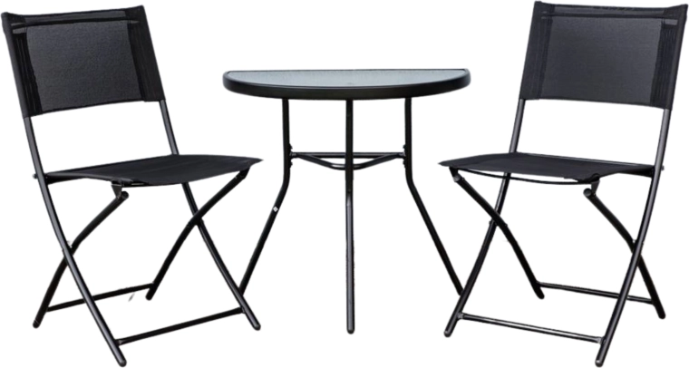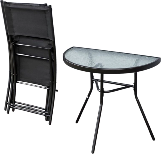 Elegantný set MARCO premení každý balkón či malú záhradu na útulné miesto na oddych. Obsahuje polkruhový stôl s tvrdeným sklom (70 × 40 × 63 cm) a dve skladacie stoličky (55 × 45,5 × 78 cm) s odolným, priedušným textilným poťahom. Vďaka skladacej konštrukcii a možnosti prisunúť stôl k stene alebo zábradliu šetrí priestor a ponúka maximálne pohodlie aj praktické využitie.