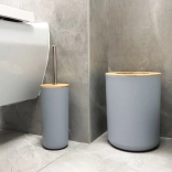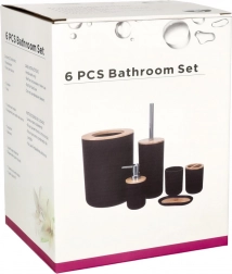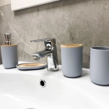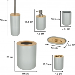 Štýlová 6-dielna kúpeľňová sada v elegantnej sivej farbe s prírodnými drevenými akcentmi zjednotí vzhľad vašej kúpeľne a ponúkne všetko potrebné pre každodennú hygienu. Obsahuje dávkovač mydla, pohárik, stojan na kefky, mydelničku, kefu na WC s držiakom a odpadkový kôš. Odolné plastové prevedenie a jednoduchá údržba zabezpečujú dlhú životnosť a moderný minimalistický vzhľad.