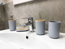 Dávkovač s chrómovou pumpičkou, stojan na kefky, pohárik a mydelnička s bambusovou vložkou udržia poriadok a hygienu každý deň.