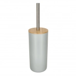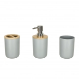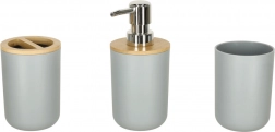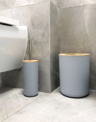 Vytvorte si jednotný a praktický priestor s kompletnou kúpeľňovou sadou v sivej farbe. Kombinácia odolného plastu a prírodných drevených detailov prináša moderný dizajn, ktorý sa hodí do moderných aj klasických kúpeľní. Chrómová pumpička dávkovača a kvalitná kovová rukoväť kefy na WC podčiarkujú funkčnosť aj estetiku.