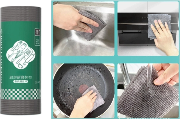 Praktická sada na každodenné upratovanie: sivé kuchynské utierky a hubky v roli s rozmermi 20 × 9 cm v balení po 25 kusoch. Ideálne na rýchle utieranie, čistenie a leštenie v kuchyni aj v domácnosti. Vďaka kompaktnému baleniu sú vždy po ruke a ľahko sa odtrhávajú. Absorpčný materiál, univerzálne použitie a úsporné balenie pre čistotu bez námahy.