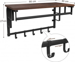 Táto viacúčelová nástenná polica prináša do každého interiéru elegantný industriálny vzhľad a praktické členenie úložného priestoru. Na hornú dosku ľahko umiestnite dekorácie, kvety či knihy, zatiaľ čo háčiky a tyč poskytnú miesto pre kabáty, kabelky aj kľúče. Kovový rám zaisťuje vysokú stabilitu a dlhú životnosť aj pri každodennom používaní.