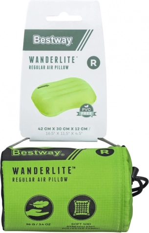 Nafukovací vankúš Bestway WanderLite je vyrobený z odolného materiálu ToughLite a mäkkého, pružného polyesterového úpletu 50D. Je ľahký a nezaberá veľa miesta, ľahko sa skladá a prenáša. Vďaka obalu, do ktorého ho po každom použití môžete uložiť, je skladovanie jednoduchšie.