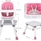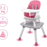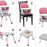 • 6 funkcií v 1: vysoká stolička s pultíkom, nadstavba na jedálenskú stoličku, nízka stolička s pultíkom, stolička + stolík, stolík s doskou na kocky, nízky taburet