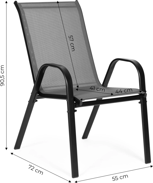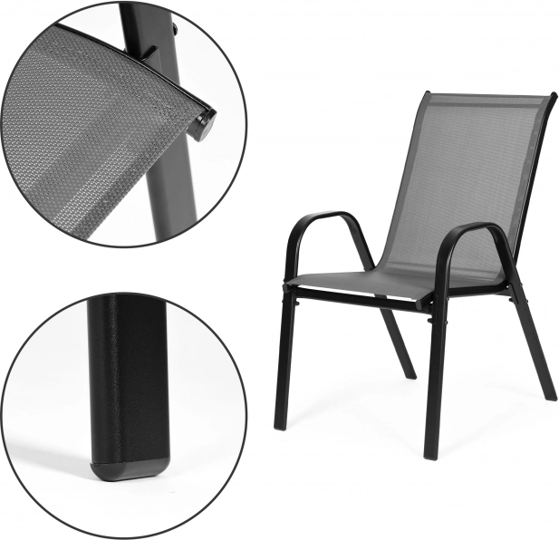 Textilná sieťovina, ktorá tvorí sedadlo a operadlo, je vodeodolná a rýchloschnúca, takže ľahko odoláva dažďu aj rannej rose. Protišmykové nožičky chránia povrch podlahy pred poškriabaním a zaisťujú stabilitu pri sedení. Vďaka možnosti stohovania šetriť miesto pri uskladnení v dobe, keď sa nepoužívajú.