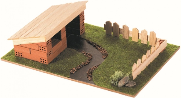 - viac než 30 prírodných hlinených tehličiek, viac než 1,8 m drevených doštičiek, základová doska, obrázkový návod, papierové figurky, dekoračné doplnky, lepidlo