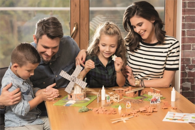 - Skutočné materiály: prírodné hlinené tehličky a drevené doštičky pre realistickú stavbu.