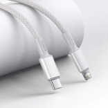 Technické špecifikácie zahŕňajú USB-C a Lightning konektory, bielu farbu a odolnú konštrukciu s nylonovým pletením.