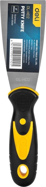 Univerzálna nerezová špachtľa na tmel so šírkou 50 mm od Deli Tools pre renovácie a maliarske práce. Odolná proti korózii, pružná čepeľ a komfortná rukoväť s otvorom na zavesenie uľahčia tmelenie, škrabanie aj vyrovnávanie povrchov.