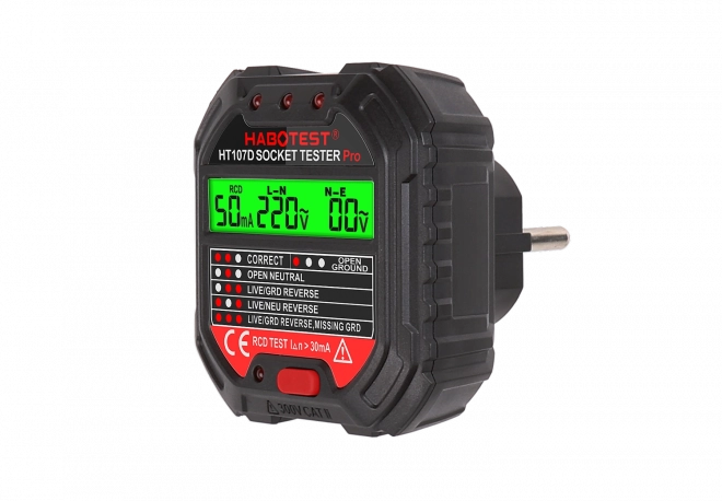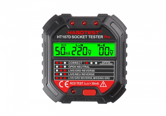 Zaistite si bezpečnosť a prehľad o stave elektrických zásuviek. Tester HABOTEST HT107D ponúka prehľadný LCD displej s podsvietením, ktorý zobrazuje aktuálne napätie aj výsledok testu zapojenia. LED indikátory v hornej časti jasne signalizujú správne zapojenie, chýbajúci ochranný vodič, prerušený nulový vodič či iné chyby. Jediným stlačením tlačidla vykonáte aj funkčný test RCD.