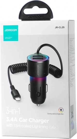 Autonabíjačka Joyroom vám poskytne rýchle a efektívne nabíjanie na cestách s výkonom až 17 W. Dvojica USB portov spolu s Lightning káblom umožňuje nabíjať až tri zariadenia naraz. Užite si rýchle nabíjanie vďaka prúdovému výkonu až 3A.
