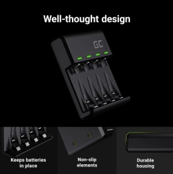 Chytrá mechanika drží batérie pevne na mieste a uľahčuje ich vkladanie aj vyberanie. Odolné ABS telo s protišmykom a pokročilé bezpečnostné obvody (tepelná, proti prepätiu a proti skratu) chránia vás aj vaše akumulátory a zaistia dlhú životnosť.
