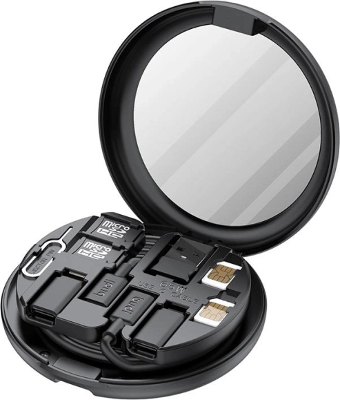 - 12v1 organizér – sloty na SIM/microSD, držiak telefónu, zrkadielko, kábel a adaptéry.