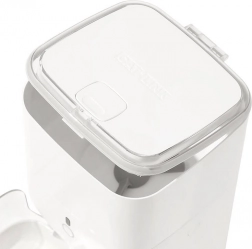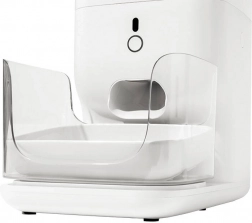 Premyslený systém tesnenia, automatické uzatváranie výsypky a zásobník so sušidlom udržujú granuly čerstvé a chrumkavé, zatiaľ čo konštrukcia bráni upchávaniu (granuly do 16 mm). Miska s ergonomickým sklonom 7° je pohodlná na kŕmenie a všetky časti sa ľahko čistia. Napájanie je zabezpečené adaptérom alebo 4× AA batériami pre pokoj aj pri výpadku prúdu.