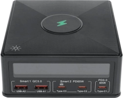 Integrovaná bezdrôtová podložka 15 W pridáva pohodlie bez káblov. LCD displej sprehľadní priebeh nabíjania, protišmykové prvky a kontrola teploty zvýšia bezpečnosť. Kvalitná konštrukcia z PC+ABS je odolná pre domácnosť aj kanceláriu a široký vstup AC 100–240 V sa hodí na cestách.