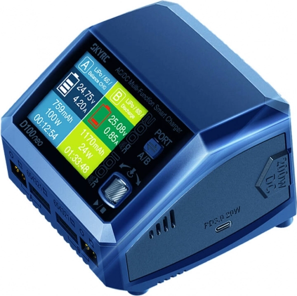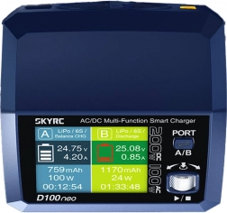 Kompaktná duálna nabíjačka SKYRC D100neo ponúka súčasné nabíjanie na 2 portoch s výkonom až 200 W DC (AC až 100 W), prúdom až 10 A na kanál a presným balansovaním ±0,02 V. Podporuje širokú škálu akumulátorov (LiPo, LiFe, Li-ion, LiHV, NiMH, NiCd, Pb), má farebný 2,8" displej, USB‑C Power Delivery 20 W pre rýchle nabíjanie zariadení a pokročilé bezpečnostné funkcie pre spoľahlivú prevádzku.