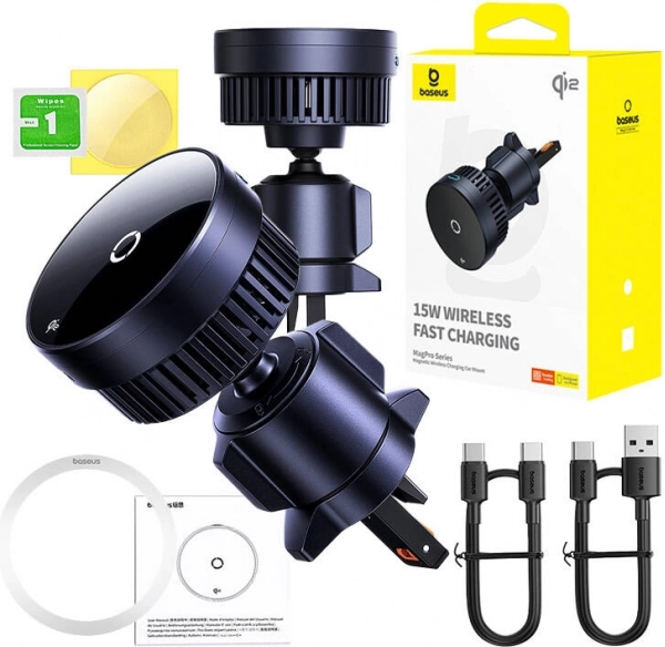 - držiak do auta, magnetický krúžok, kábel USB-A–USB-C, kábel USB-C–USB-C, utierka s alkoholom, antistatická nálepka, používateľská príručka