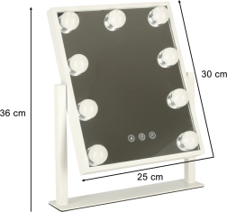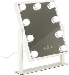 Elegantné kozmetické zrkadlo v štýle Hollywood s 9 LED žiarovkami poskytuje rovnomerné a prirodzené osvetlenie pre bezchybný make-up. Dotykový panel umožňuje zmenu teploty farby (studená/teplá/neutrálna) aj plynulé stmievanie. Stabilná kovová konštrukcia, USB napájanie a praktický rozmer 25 × 30 cm robia zo zrkadla štýlový a funkčný doplnok každej toaletky.
