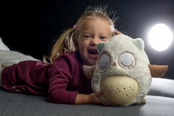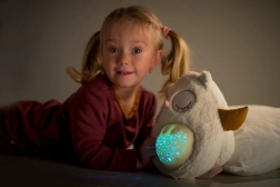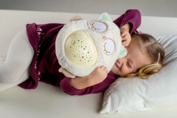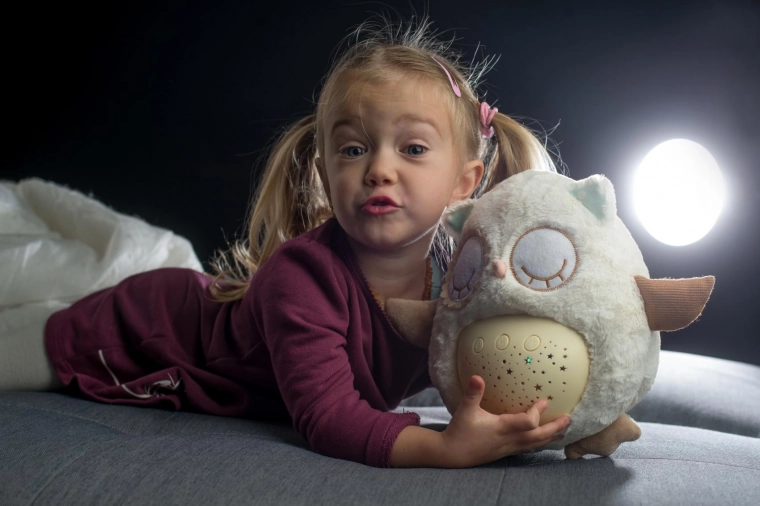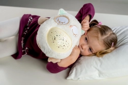 Sovička premieta nočnú oblohu v 8 farebných odtieňoch, ktoré navodia príjemnú atmosféru na zaspávanie a upokoja zmysly bábätka.