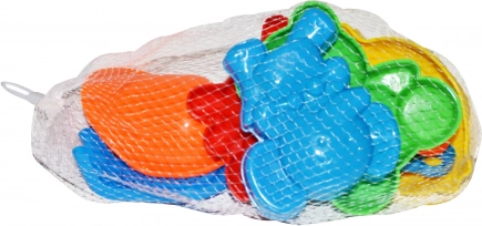 Farebná plastová sada na piesok so zvieratkami, ideálna pre pieskovisko aj pláž. Obsahuje lopatku, hrable a 4 formičky.