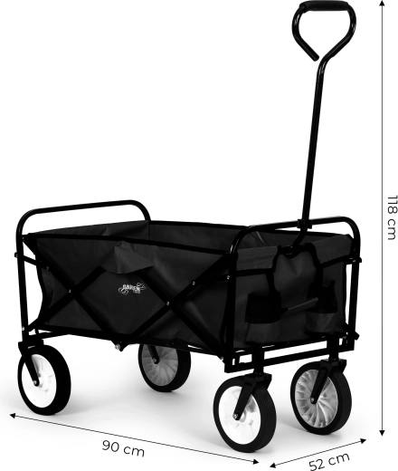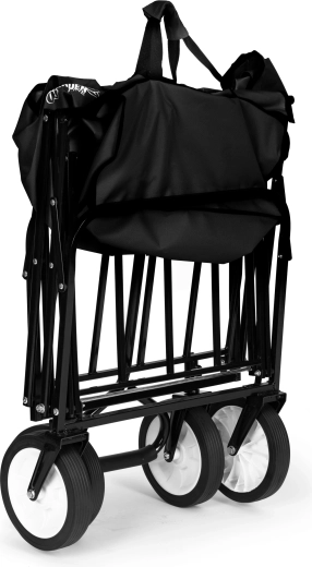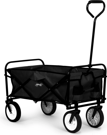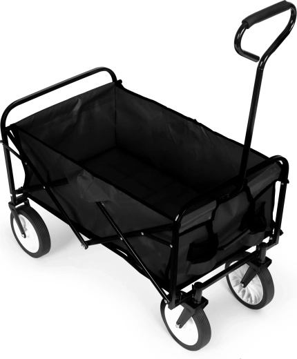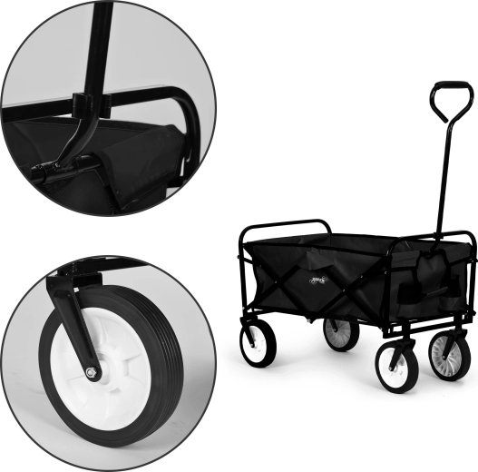 Vozík má otočné kolesá o 360° pre ľahké manévrovanie aj v úzkych priestoroch, vodoodolný materiál na použitie za každého počasia a široké pohodlné madlo pre istý úchop. Po použití ho behom chvíľky zložíte do kompaktnej veľkosti, takže nezaberie takmer žiadne miesto.