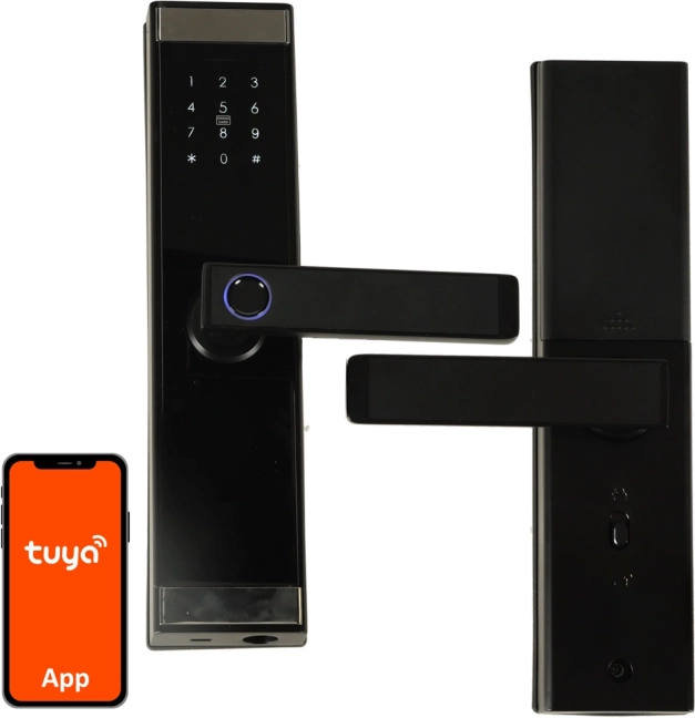 - Dotyková klávesnica, čítačka odtlačkov, RFID, mechanický kľúč, aplikácia Tuya