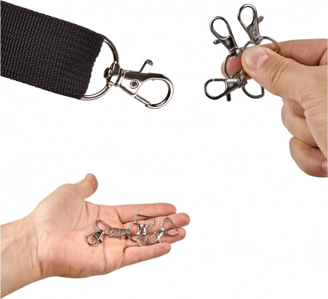 Sada karabínok „rybka“ prináša všetko, čo potrebujete na šitie, výrobu reklamných pútok, opravy tašiek a batohov či tvorbu vlastných kľúčeniek. Robustná zinkovo-železná zliatina a otočný mechanizmus zaručujú pohodlné používanie bez krútenia pripevnených popruhov.