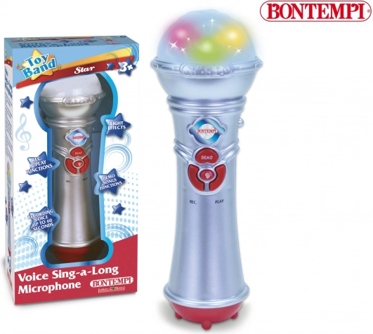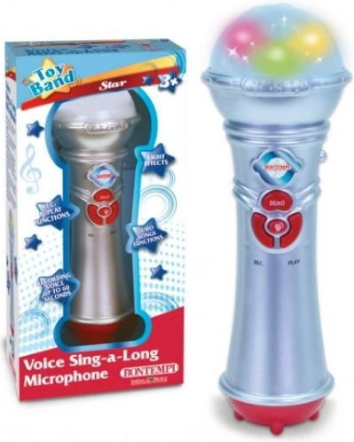 Hlasový mikrofón s funkciou nahrávania a prehrávania - 4 demonštračné piesne - Efekty potlesku - Svetelné efekty - Napájanie: 3 batérie R 03 / AAA 1,5 V (nie sú súčasťou dodávky) - Rozmery: 72x72x210 mm