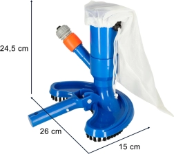 Montáž zvládnete behom chvíľky: pripojte rýchlospojku k záhradnej hadici, nasaďte vysávač na štandardnú tyč 30 mm a ponorte do vody. Zachytené nečistoty skončia v sieťovom sáčku, ktorý po upratovaní jednoducho vysypete a znovu použijete. Ideálne pre bazény, vírivky aj záhradné jazierka.