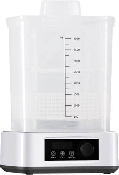 Čistiaci kôš s objemom 3 l a umývací modul 4 l pojmú výtlačok až do 165 × 100 × 180 mm (v koši) alebo 165 × 100 × 165 mm (na platforme). Priestor na vytvrdzovanie má Ø160 × 180 mm.