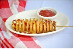 Podávajte špirálové zemiaky na špajdli s obľúbenými dipmi a korením – efektný snack, ktorý poteší deti aj dospelých.