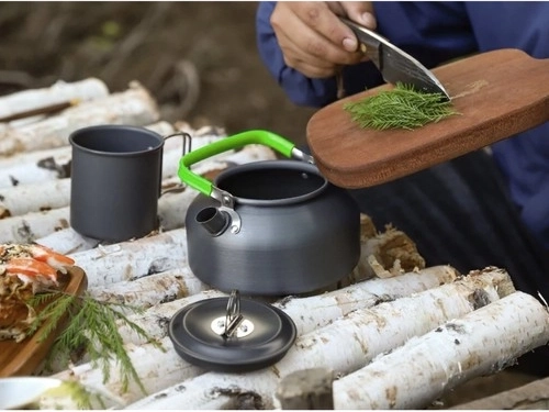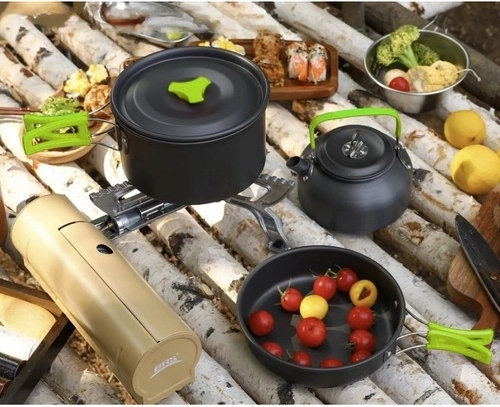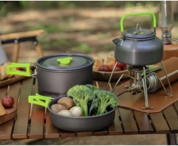 Kompaktná kempingová sada riadu pre 2 osoby s nepriľnavým povrchom a skladacími rukoväťami. Obsahuje hrniec, panvicu, kanvičku, skladacie príbory, skladacie poháriky a praktický transportný vrecúšok. Ideálna na kempovanie, turistiku aj varenie vonku.