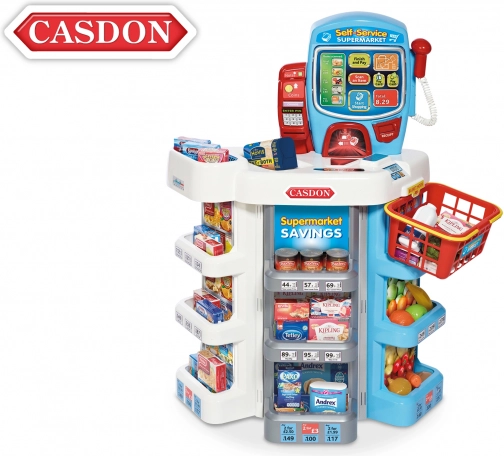 Štýlová detská samoobslužná pokladňa Casdon premení hru na obchod na skutočný zážitok: ponúka realistické zvuky, dotykovú obrazovku a elektronický displej. Nechýba terminál chip and pin, skener, bankovky a mince, repliky potravín a nákupný košík. Výška 75 cm, vhodné od 3 rokov.