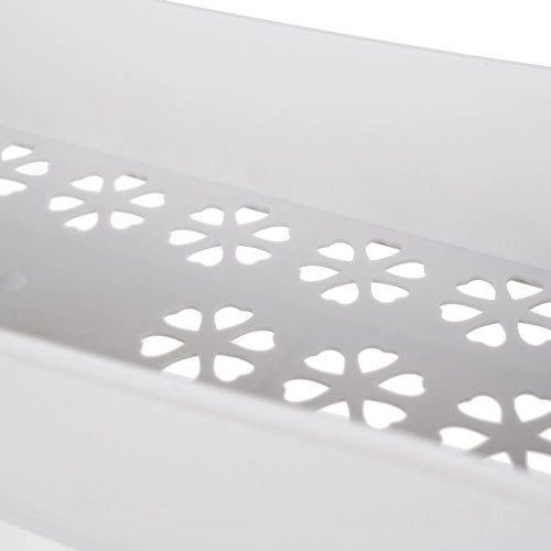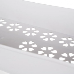 Kombinácia presne lícovaných spojov z nehrdzavejúcej ocele a kvalitného PP zabezpečuje stabilitu a dlhú životnosť. Perforované dno políc s kvetinovým motívom nielen skrášli interiér, ale tiež zlepšuje odvod vlhkosti. Štyri otočné kolieska umožnia plynulé presuny aj v stiesnených priestoroch a praktické háčiky po stranách udržia uteráky, hubky či kefy po ruke.