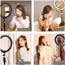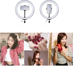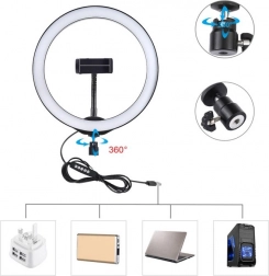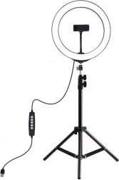 Integrovaný držiak pre smartfóny so šírkou 5,7–9 cm je uprostred kruhu pre rovnomerné nasvietenie bez tieňov. Napájanie cez USB z PC, adaptéra či powerbanky.